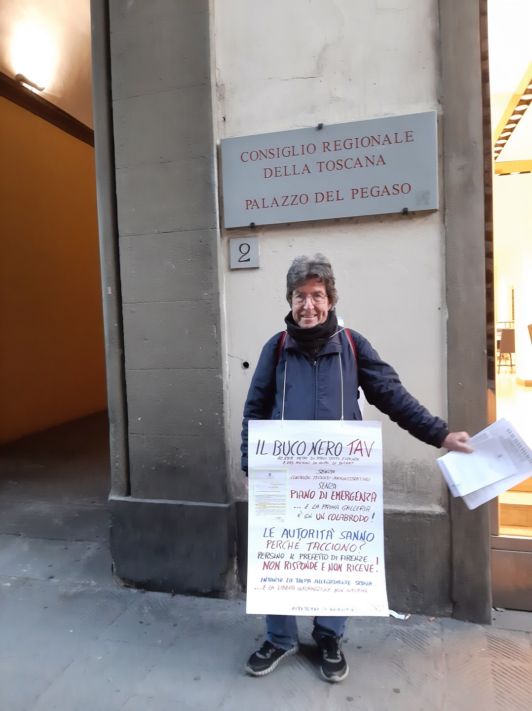 Intanto anche Marco si è trasformato in uomo-sandwich e perora a pochi metri da me, davanti all’altro ingresso del Consiglio, al civico 4, la causa mai tramontata di Piombino-rigassificata-a-forza. Con buoni risultati anche lui, mi conforta.